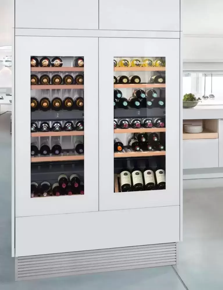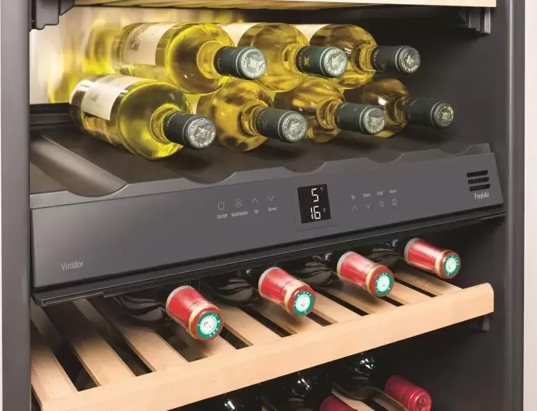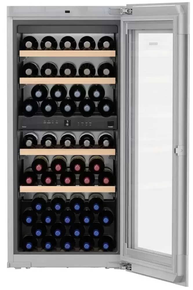 Винный шкаф Liebherr EWTgw 2383 Vinidor — встраиваемый прибор с двумя независимыми температурными зонами. Устройство устанавливается в специальную нишу в мебельном гарнитуре, благодаря чему можно экономить полезное пространство, а также гармонично вписать технику в любое интерьерное решение. Модель оснащена шестью просторными полками, на которых можно одновременно разместить до пятидесяти одной бутылки типа «Бордо». Для регулировки режимных параметров и предусмотрена сенсорная контрольная панель с цифровым дисплеем. Каждый элемент отличается повышенной чувствительностью, поэтому для активации необходимой кнопки будет достаточно легкого прикосновения. Модель из известной серии Vinidor способна поддерживать температуру в каждой зоне в пределах от +5 °С до +20 °С. Полки изготовлены из натурального дерева, телескопические направляющие позволяют легко выдвинуть их наружу. Наилучшим образом представить коллекцию, а том числе уже открытые бутылки, поможет специальная демонстрационная полка, на которой можно разместить до 6 бутылок.