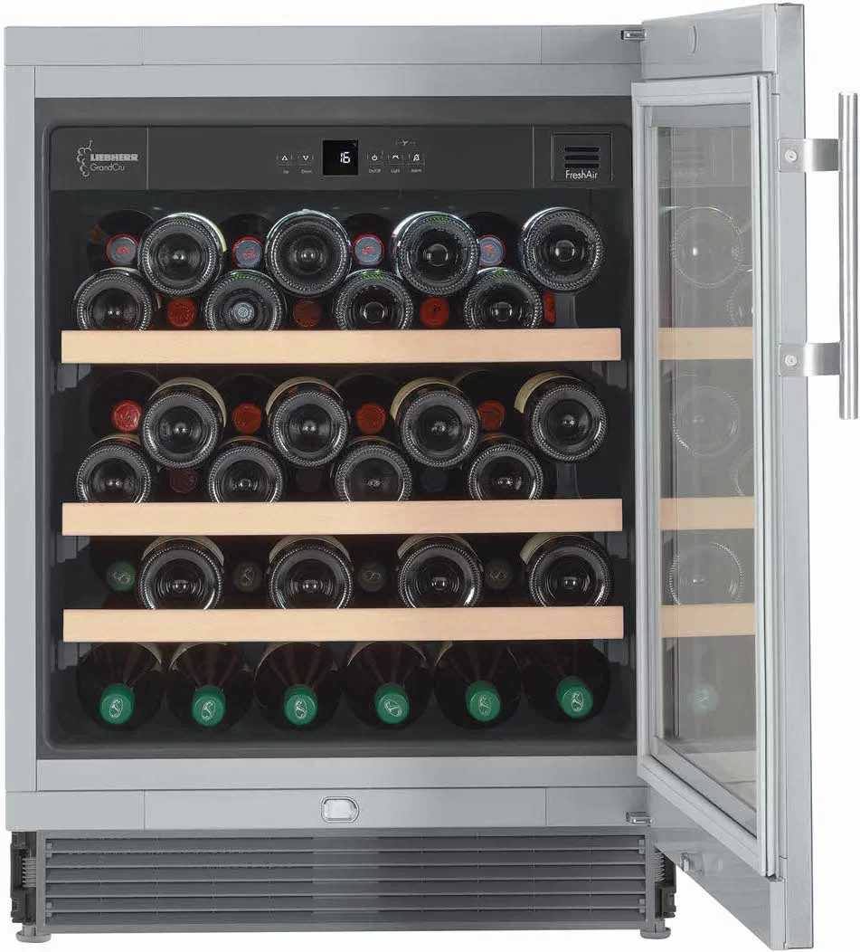 Винный шкаф Liebherr UWKes 1752 — модель австрийского производства высотой 81 см и вместимостью 46 бутылок для размещения под столешницей. Фасад изготовлен из нержавеющей стали и дополнен удобной вертикальной ручкой. Сенсорное управление с ЖК-дисплеем MagicEye позволяет настраивать температуру в диапазоне + 5°С до +20°С и выбирать прочие параметры работы. Панель управления можно заблокировать от детей. Стальная дверца с изолирующим стеклопакетом защищает вино от проникновения ультрафиолета. Корпус целиком изготовлен из стали и отличается особой прочностью. Автоматическая система размораживания упрощает уход за прибором. Три полки, изготовленные из натурального дерева, можно легко выдвинуть на телескопических направляющих. О превышении заданной температуры в камере и других неисправностях оповещает световая и звуковая сигнализация. Сменный фильтр из активированного угля защищает от посторонних запахов, которые могут возникнуть при длительном хранении. Модель относится к климатическому классу SN-ST и может эксплуатироваться в широком диапазоне температур от + 10 до +38 °С. Сохранности коллекции вин способствует малый уровень шума 40 дБ.