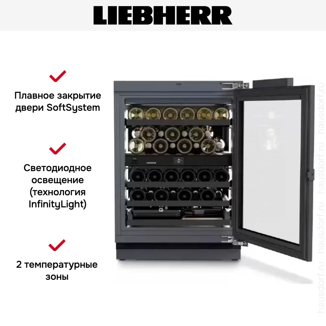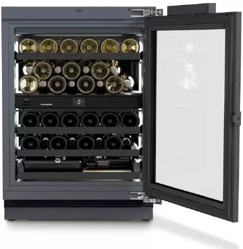 Винный холодильник Liebherr UWpri 3782 имеет две температурные зоны, в которых одновременно можно хранить разные сорта алкоголя и выставлять разные сочетания настроек. Он встраивается в нишу, что удобно, если у вас ограничен метраж помещения. Благодаря компактным размерам данная модель — отличный выбор для офиса, гостиничного номера. Количество бутылок, которое можно разместить с учетом полной комплектации и из расчета объема бутылки 0,75 л, — 38 шт.