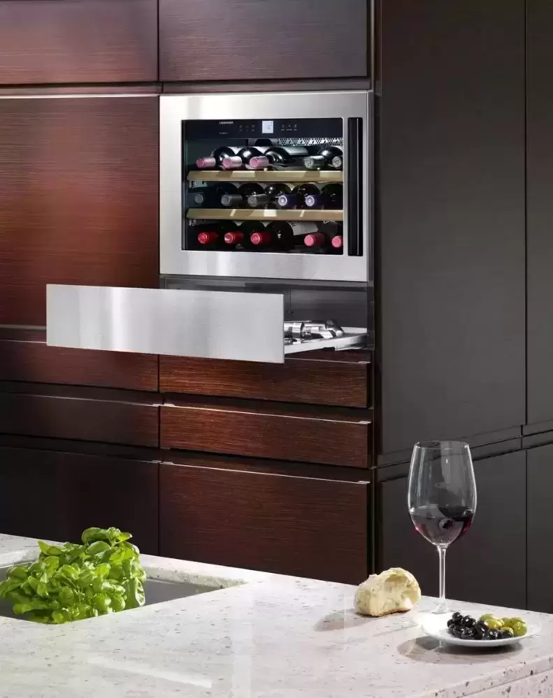 Модель высотой 45 см специально разработана для устраивания в колонну на любой удобной высоте. Климатический класс SN позволяет использовать устройство при комнатной температуре в диапазоне от +10 °C до +32 °C. Расположенная за стеклом панель управления оснащена емкостной сенсорной технологией, согласно которой каждую функцию можно активировать прикосновением к соответствующему символу. Для длительного хранения вин рекомендуется устанавливать температуру от 10 °C до 14 °C. Для подготовки к подаче на стол красного вина его следует охладить до температуры от+14 °C до +18 °C. Для розовых вин этот диапазон составляет от +10 °C до +12 °C, а для белых — от +8 °C до +12 °C. Благодаря конструкции полок в винном шкафу можно хранить и вино в бутылках увеличенного размера — например, шампанское. Бутылки при этом располагаются вдоль, а для надежности ограничиваются опорными рейками. Фильтр из активированного угля позволяет очистить воздух в камере от посторонних запахов. Если дверь открыта дольше одной минуты, подается предупредительный звуковой сигнал. Если температура превысила допустимые значения, также подается звуковой сигнал и мигает индикатор температуры.