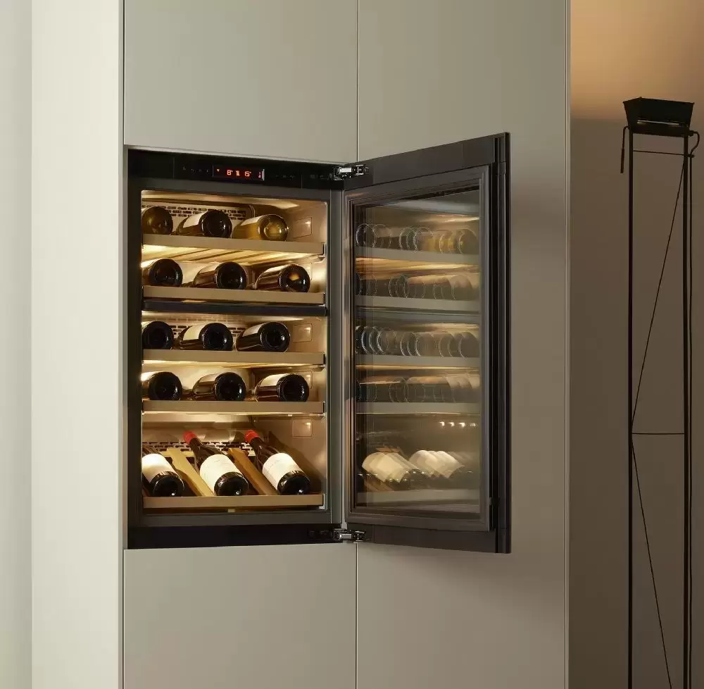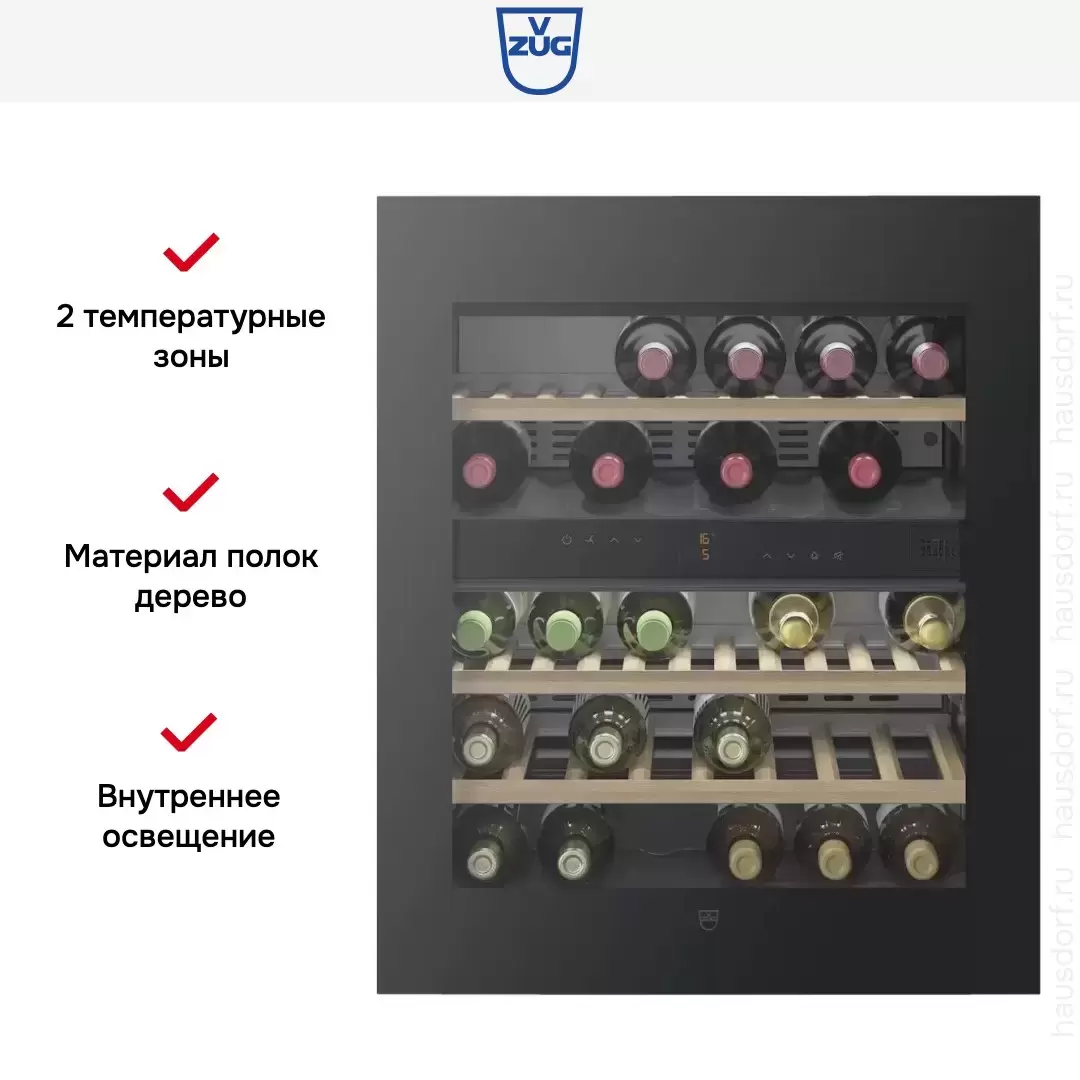 Винный холодильник V-ZUG WC4T-51136 имеет две температурные зоны, в которых одновременно можно хранить разные сорта алкоголя и выставлять разные сочетания настроек. Он встраивается в нишу, что удобно, если у вас ограничен метраж помещения. Благодаря компактным размерам данная модель — отличный выбор для офиса, гостиничного номера. Количество бутылок, которое можно разместить с учетом полной комплектации и из расчета объема бутылки 0,75 л, — 34 шт.
