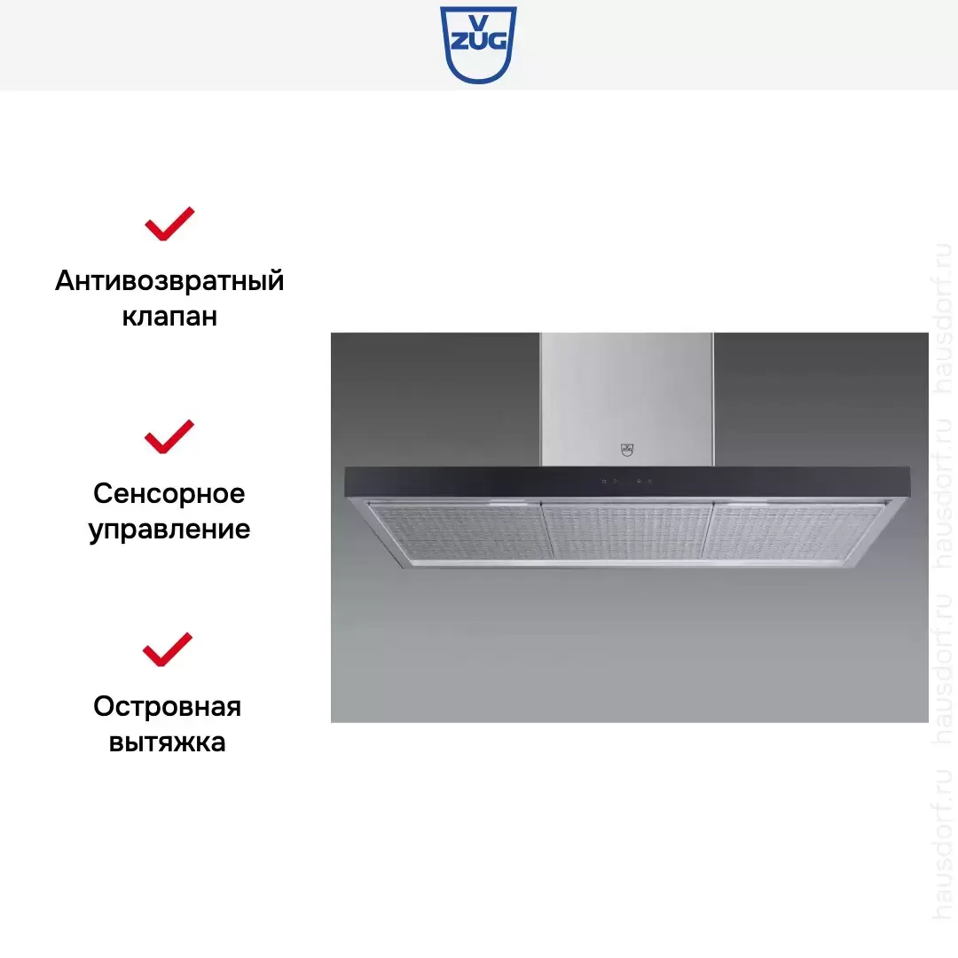 Данная вытяжка крепится к потолку — обычно над кухонным островом, где расположена рабочая зона. Обратите внимание на цветовые сочетания модели V-ZUG AI6T12LQTLG, чтобы органично вписать ее в свою квартиру. Оттенок корпуса: нержавеющая сталь/черное стекло. Благодаря лампочкам, которые расположены на нем, можно освещать плиту и столешницу рядом, чтобы готовить было еще проще и приятнее.