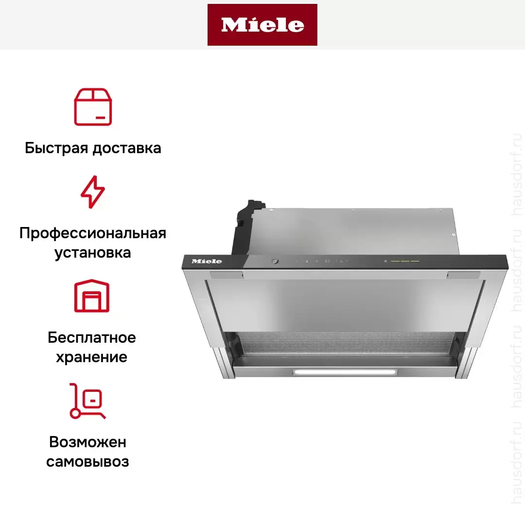 Встраиваемая вытяжка — выбор тех, кто хочет максимально задекорировать технику, или владельцев маленькой кухни. Тип встраивания: в шкаф. Обратите внимание на цветовые сочетания модели Miele DAS 4630 OBSW, чтобы органично вписать ее в свою квартиру. Оттенок корпуса: черный обсидиан. Благодаря лампочкам, которые расположены на нем, можно освещать плиту и столешницу рядом, чтобы готовить было еще проще и приятнее. Фишка этой техники — выдвижная панель.