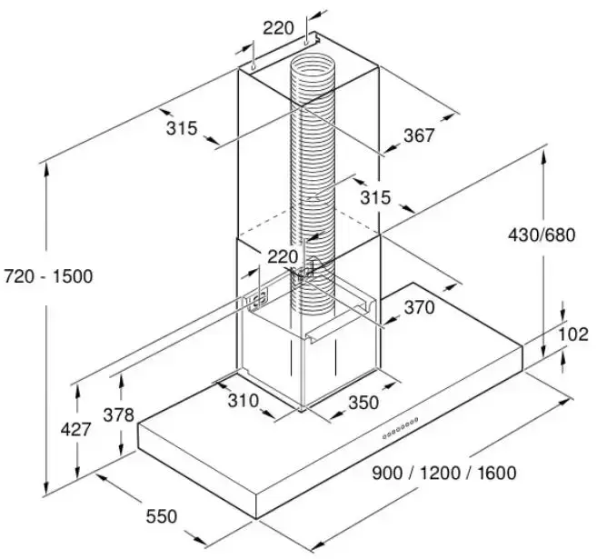 Вытяжка работает в режиме отвода, воздух принудительно всасывается и перенаправляется во воздуховод. Количество скоростей в этой модели: 3 шт. Уровень шума при полной загруженности — 64 дБ.