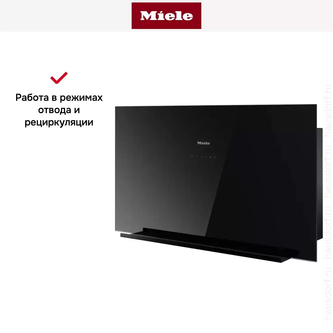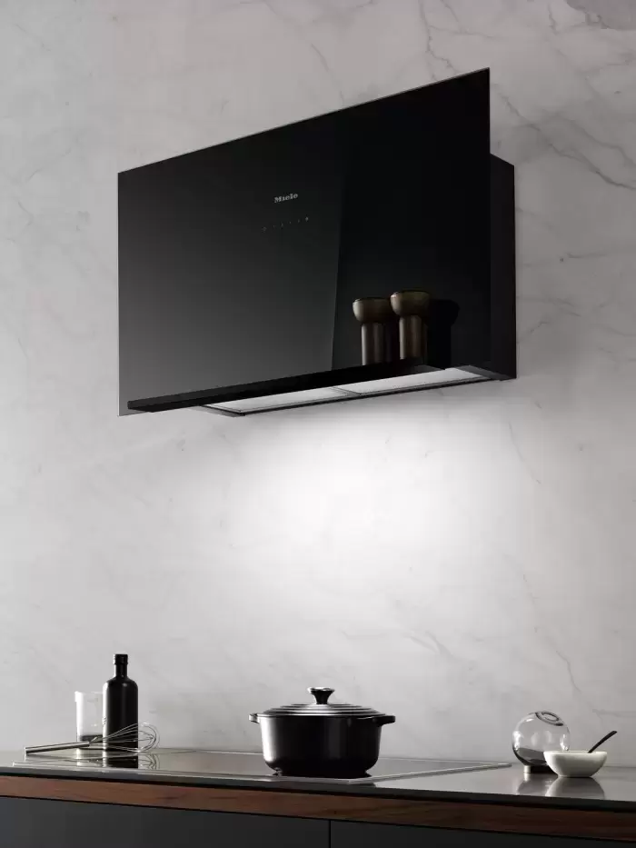 Крепление вытяжки к стене — стандартное для многих моделей, ими удобно управлять, так как кнопки находятся на расстоянии вытянутой руки. Обратите внимание на цветовые сочетания модели Miele DA 9092 W OBSW, чтобы органично вписать ее в свою квартиру. Оттенок корпуса: черный обсидиан. Благодаря лампочкам, которые расположены на нем, можно освещать плиту и столешницу рядом, чтобы готовить было еще проще и приятнее.